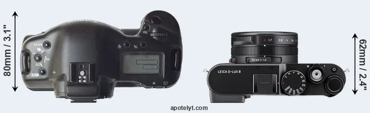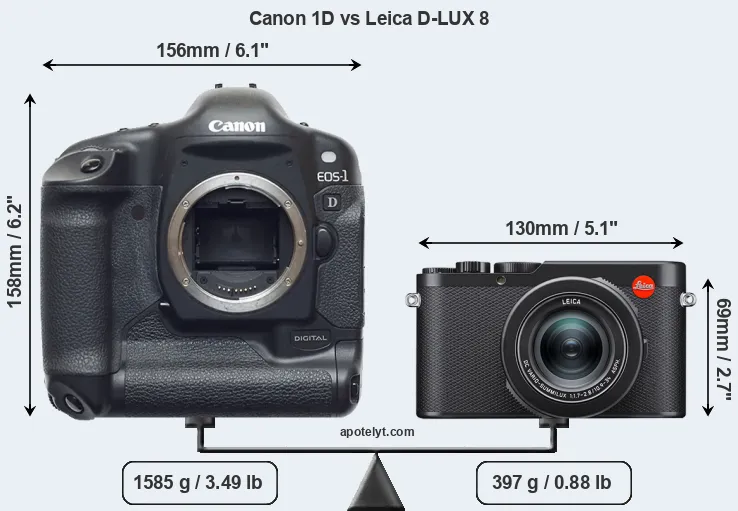If the front view area (width x height) of the cameras is taken as an aggregate measure of their size, the Leica D-LUX 8 is considerably smaller (64 percent) than the Canon 1D. It is worth mentioning in this context that the 1D is splash and dust resistant, while the D-LUX 8 does not feature any corresponding weather-sealing.