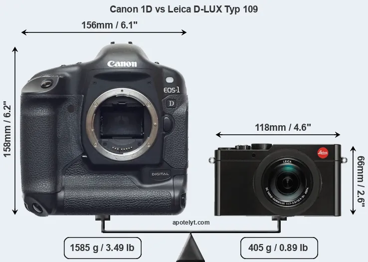 The side-by-side display below illustrates the physical size and weight of the Canon 1D and the Leica D-LUX Typ 109. The two cameras are presented according to their relative size. Three consecutive views from the front, the top, and the rear side are shown. All width, height and depth dimensions are rounded to the nearest millimeter.