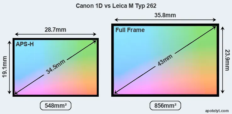 Of the two cameras under consideration, the Canon 1D features an APS-H sensor and the Leica M Typ 262 a full frame sensor. The sensor area in the M Typ 262 is 56 percent bigger. As a result of these sensor size differences, the cameras have a format factor of, respectively, 1.3 and 1.0. Both cameras have a native aspect ratio (sensor width to sensor height) of 3:2.