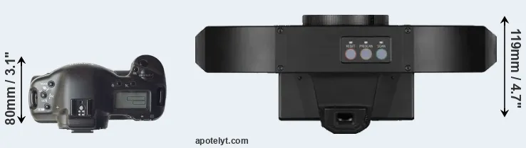 The physical size and weight of the Canon 1D and the Leica S1 are illustrated in the side-by-side display below. The two cameras are presented according to their relative size. Three successive views from the front, the top, and the rear are shown. All size dimensions are rounded to the nearest millimeter.