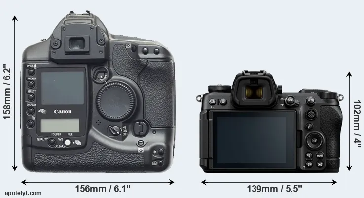 The Canon EOS-1D and the Nikon Z6 III are two digital cameras that were announced, respectively, in September 2001 and June 2024. The 1D is a DSLR, while the Z6 III is a mirrorless interchangeable lens camera. The cameras are based on an APS-H (1D) and a full frame (Z6 III) sensor. The Canon has a resolution of 4.1 megapixels, whereas the Nikon provides 24.3 MP.