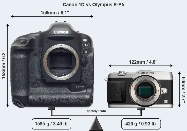 An illustration of the physical size and weight of the Canon 1D and the Olympus E-P5 is provided in the side-by-side display below. The two cameras are presented according to their relative size. Three consecutive views from the front, the top, and the rear side are shown. All width, height and depth dimensions are rounded to the nearest millimeter.