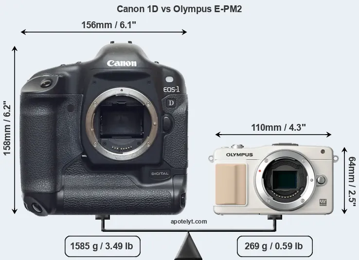 An illustration of the physical size and weight of the Canon 1D and the Olympus E-PM2 is provided in the side-by-side display below. The two cameras are presented according to their relative size. Three consecutive views from the front, the top, and the rear side are shown. All width, height and depth measures are rounded to the nearest millimeter.