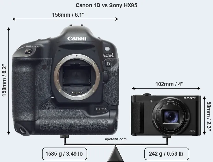 An illustration of the physical size and weight of the Canon 1D and the Sony HX95 is provided in the side-by-side display below. The two cameras are presented according to their relative size. Three consecutive perspectives from the front, the top, and the back are available. All width, height and depth measures are rounded to the nearest millimeter.