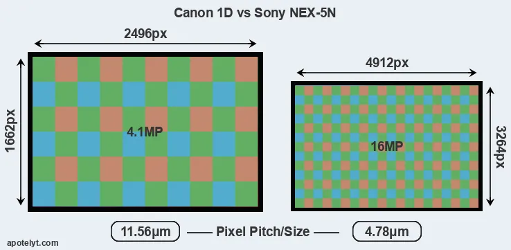 Despite having a smaller sensor, the NEX-5N offers a higher resolution of 16 megapixels, compared with 4.1 MP of the 1D. This megapixels advantage comes at the cost of a higher pixel density and a smaller size of the individual pixel (with a pixel pitch of 4.78μm versus 11.56μm for the 1D). However, it should be noted that the NEX-5N is much more recent (by 9 years and 11 months) than the 1D, and its sensor will have benefitted from technological advances during this time that make it possible to gather light more efficiently.
