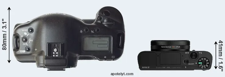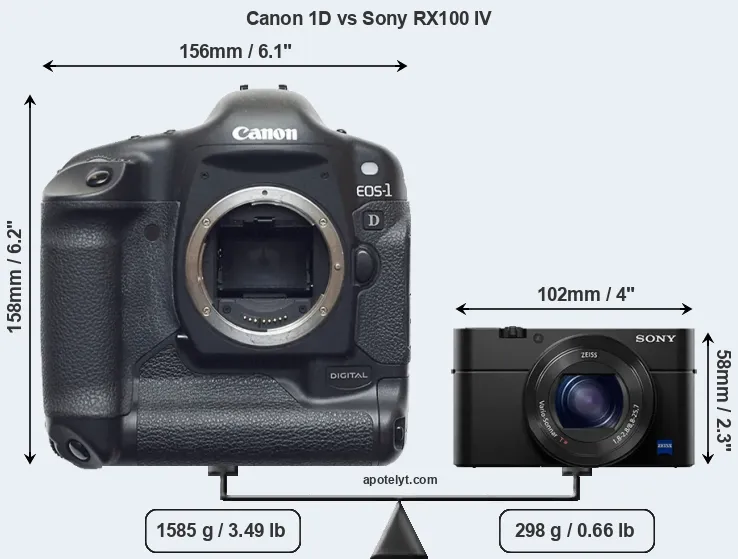 The physical size and weight of the Canon 1D and the Sony RX100 IV are illustrated in the side-by-side display below. The two cameras are presented according to their relative size. Three successive views from the front, the top, and the rear are shown. All width, height and depth measures are rounded to the nearest millimeter.