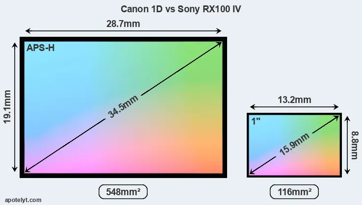 Of the two cameras under consideration, the Canon 1D features an APS-H sensor and the Sony RX100 IV an one-inch sensor. The sensor area in the RX100 IV is 79 percent smaller. As a result of these sensor size differences, the cameras have a format factor of, respectively, 1.3 and 2.7. Both cameras have a native aspect ratio (sensor width to sensor height) of 3:2.