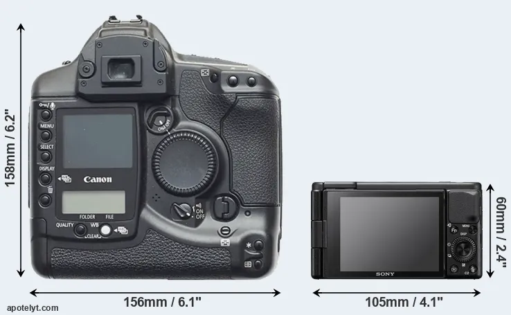 An illustration of the physical size and weight of the Canon 1D and the Sony ZV-1 is provided in the side-by-side display below. The two cameras are presented according to their relative size. Three consecutive views from the front, the top, and the rear side are shown. All size dimensions are rounded to the nearest millimeter.