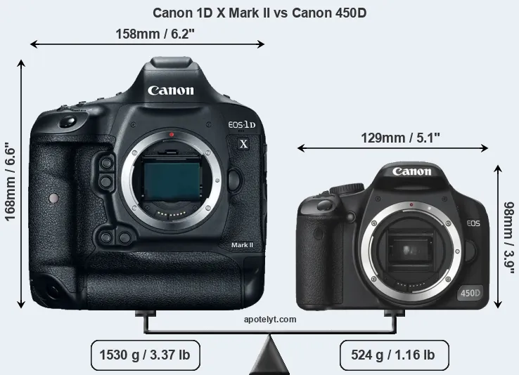 The physical size and weight of the Canon 1D X Mark II and the Canon 450D are illustrated in the side-by-side display below. The two cameras are presented according to their relative size. Three consecutive views from the front, the top, and the rear side are shown. All size dimensions are rounded to the nearest millimeter.