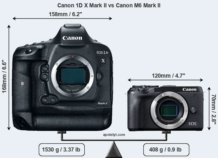 If the front view area (width x height) of the cameras is taken as an aggregate measure of their size, the Canon M6 Mark II is considerably smaller (68 percent) than the Canon 1D X Mark II. Moreover, the M6 Mark II is substantially lighter (73 percent) than the 1DX Mark II. It is worth mentioning in this context that the 1DX Mark II is splash and dust resistant, while the M6 Mark II does not feature any corresponding weather-sealing.