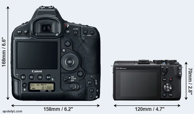 The physical size and weight of the Canon 1D X Mark II and the Canon M6 Mark II are illustrated in the side-by-side display below. The two cameras are presented according to their relative size. Three successive views from the front, the top, and the rear are shown. All size dimensions are rounded to the nearest millimeter.