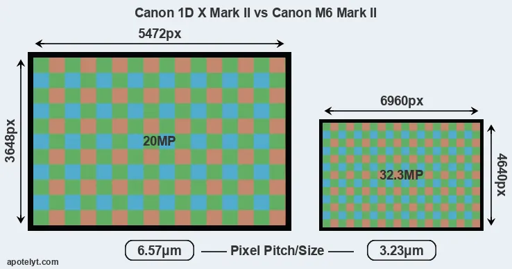 Despite having a smaller sensor, the M6 Mark II offers a higher resolution of 32.3 megapixels, compared with 20 MP of the 1DX Mark II. This megapixels advantage comes at the cost of a higher pixel density and a smaller size of the individual pixel (with a pixel pitch of 3.23μm versus 6.57μm for the 1DX Mark II). However, it should be noted that the M6 Mark II is much more recent (by 3 years and 6 months) than the 1DX Mark II, and its sensor will have benefitted from technological advances during this time that make it possible to gather light more efficiently.
