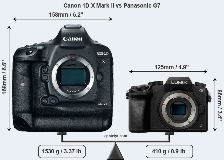 The physical size and weight of the Canon 1D X Mark II and the Panasonic G7 are illustrated in the side-by-side display below. The two cameras are presented according to their relative size. Three consecutive perspectives from the front, the top, and the back are available. All size dimensions are rounded to the nearest millimeter.