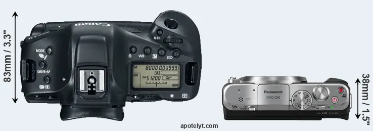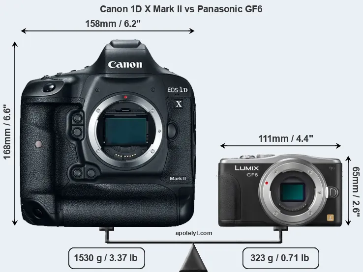 An illustration of the physical size and weight of the Canon 1D X Mark II and the Panasonic GF6 is provided in the side-by-side display below. The two cameras are presented according to their relative size. Three consecutive perspectives from the front, the top, and the back are available. All width, height and depth measures are rounded to the nearest millimeter.