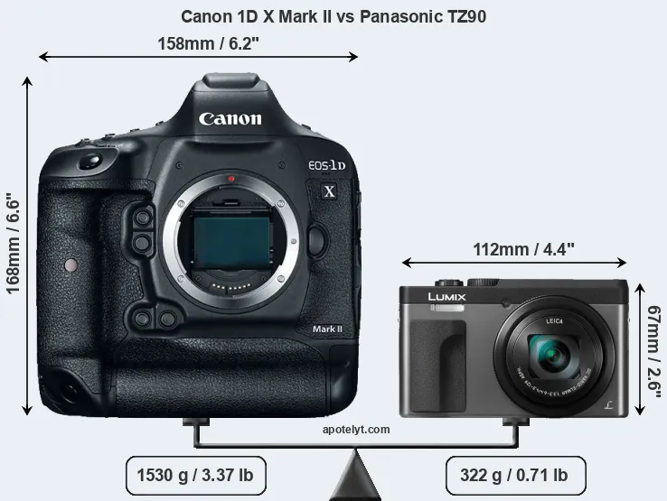 An illustration of the physical size and weight of the Canon 1D X Mark II and the Panasonic TZ90 is provided in the side-by-side display below. The two cameras are presented according to their relative size. Three consecutive views from the front, the top, and the rear side are shown. All width, height and depth dimensions are rounded to the nearest millimeter.
