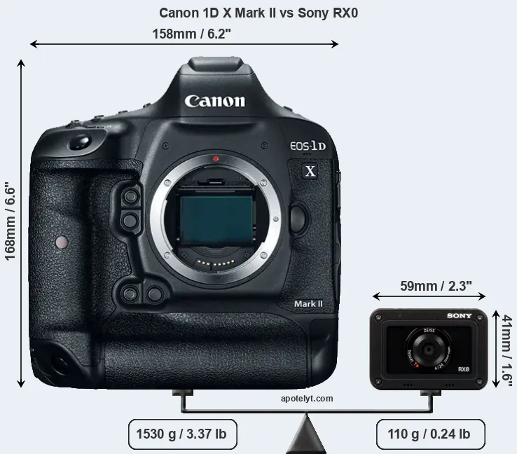 The physical size and weight of the Canon 1D X Mark II and the Sony RX0 are illustrated in the side-by-side display below. The two cameras are presented according to their relative size. Three consecutive views from the front, the top, and the rear side are shown. All width, height and depth dimensions are rounded to the nearest millimeter.