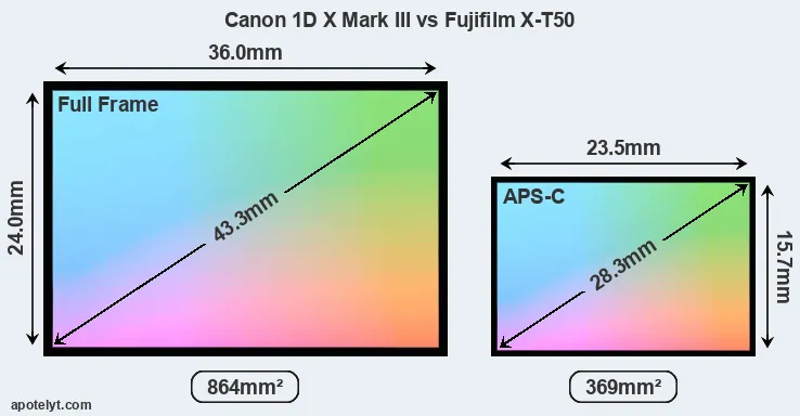 Of the two cameras under consideration, the Canon 1D X Mark III features a full frame sensor and the Fujifilm X-T50 an APS-C sensor. The sensor area in the X-T50 is 57 percent smaller. As a result of these sensor size differences, the cameras have a format factor of, respectively, 1.0 and 1.5. Both cameras have a native aspect ratio (sensor width to sensor height) of 3:2.