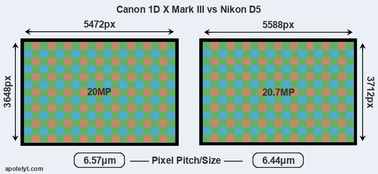 Despite having a slightly smaller sensor, the D5 offers a slightly higher resolution of 20.7 megapixels, compared with 20 MP of the 1DX Mark III. This megapixels advantage comes at the cost of a higher pixel density and a smaller size of the individual pixel (with a pixel pitch of 6.44μm versus 6.57μm for the 1DX Mark III). Moreover, it should be noted that the 1DX Mark III is much more recent (by 4 years) than the D5, and its sensor will have benefitted from technological advances during this time that further enhance the light gathering capacity of its pixels.