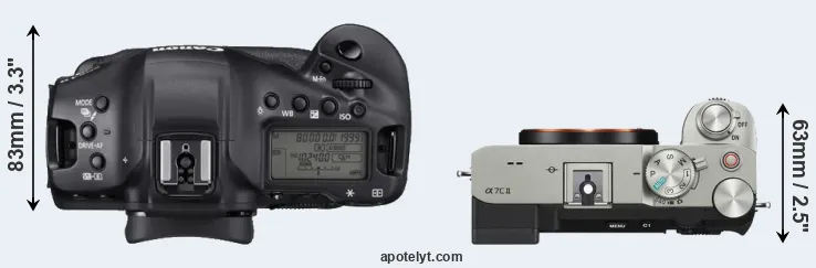 The physical size and weight of the Canon 1D X Mark III and the Sony A7C II are illustrated in the side-by-side display below. The two cameras are presented according to their relative size. Three consecutive views from the front, the top, and the rear side are shown. All size dimensions are rounded to the nearest millimeter.