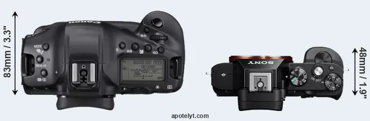 The side-by-side display below illustrates the physical size and weight of the Canon 1D X Mark III and the Sony A7R. The two cameras are presented according to their relative size. Three consecutive perspectives from the front, the top, and the back are available. All width, height and depth measures are rounded to the nearest millimeter.