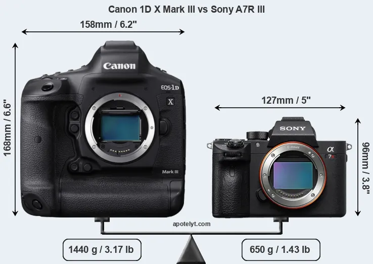The side-by-side display below illustrates the physical size and weight of the Canon 1D X Mark III and the Sony A7R III. The two cameras are presented according to their relative size. Three successive views from the front, the top, and the rear are shown. All width, height and depth dimensions are rounded to the nearest millimeter.