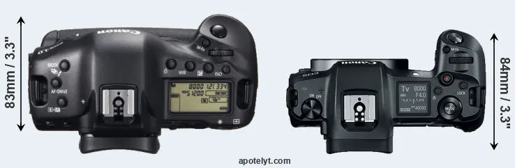 The physical size and weight of the Canon 1D X and the Canon R are illustrated in the side-by-side display below. The two cameras are presented according to their relative size. Three consecutive views from the front, the top, and the rear side are shown. All size dimensions are rounded to the nearest millimeter.