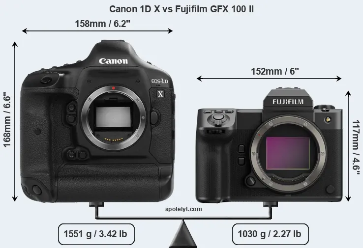 The side-by-side display below illustrates the physical size and weight of the Canon 1D X and the Fujifilm GFX 100 II. The two cameras are presented according to their relative size. Three consecutive perspectives from the front, the top, and the back are available. All width, height and depth measures are rounded to the nearest millimeter.