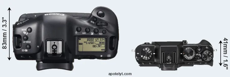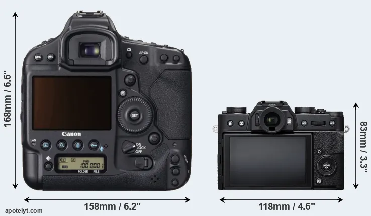 The physical size and weight of the Canon 1D X and the Fujifilm X-T20 are illustrated in the side-by-side display below. The two cameras are presented according to their relative size. Three consecutive views from the front, the top, and the rear side are shown. All width, height and depth dimensions are rounded to the nearest millimeter.