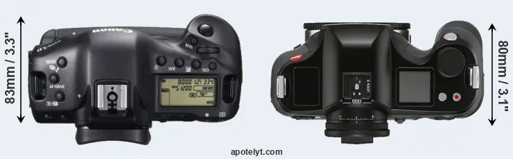 The side-by-side display below illustrates the physical size and weight of the Canon 1D X and the Leica S3. The two cameras are presented according to their relative size. Three successive views from the front, the top, and the rear are shown. All size dimensions are rounded to the nearest millimeter.