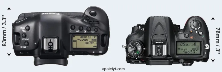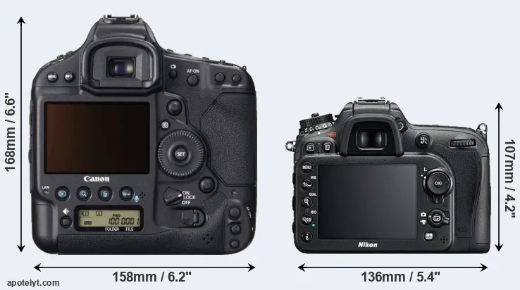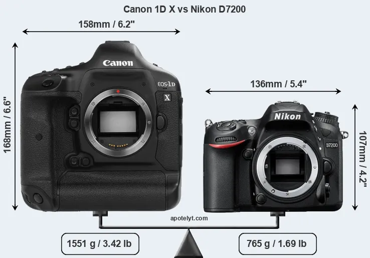 The side-by-side display below illustrates the physical size and weight of the Canon 1D X and the Nikon D7200. The two cameras are presented according to their relative size. Three consecutive views from the front, the top, and the rear side are shown. All width, height and depth dimensions are rounded to the nearest millimeter.