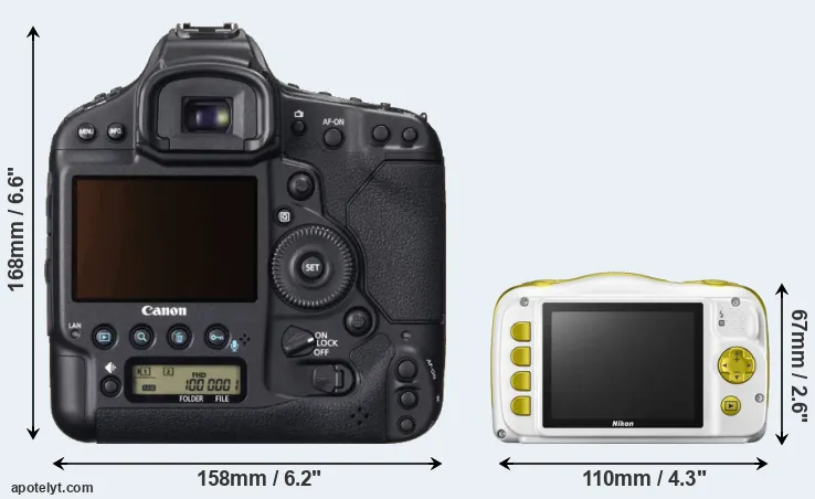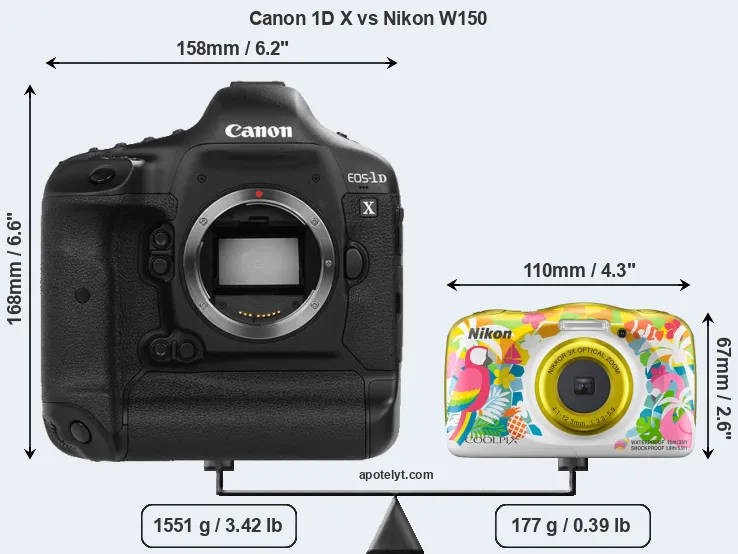The physical size and weight of the Canon 1D X and the Nikon W150 are illustrated in the side-by-side display below. The two cameras are presented according to their relative size. Three successive views from the front, the top, and the rear are shown. All width, height and depth measures are rounded to the nearest millimeter.