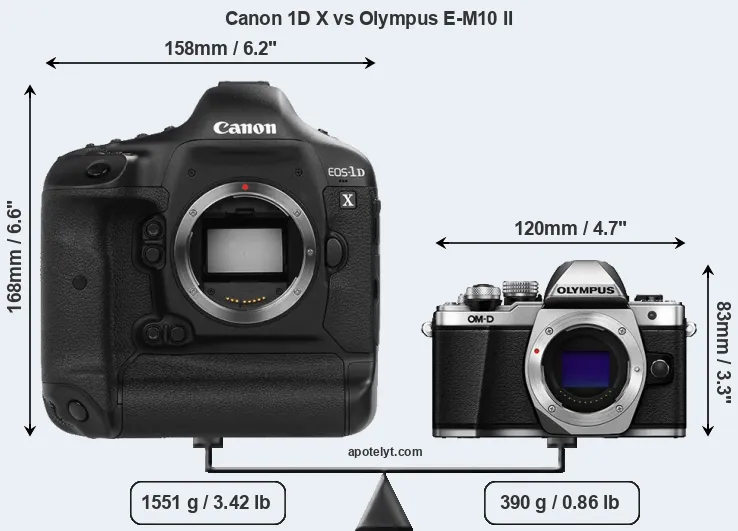 An illustration of the physical size and weight of the Canon 1D X and the Olympus E-M10 II is provided in the side-by-side display below. The two cameras are presented according to their relative size. Three consecutive perspectives from the front, the top, and the back are available. All width, height and depth measures are rounded to the nearest millimeter.