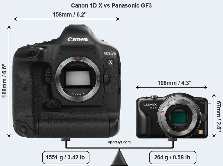 An illustration of the physical size and weight of the Canon 1D X and the Panasonic GF3 is provided in the side-by-side display below. The two cameras are presented according to their relative size. Three consecutive views from the front, the top, and the rear side are shown. All width, height and depth dimensions are rounded to the nearest millimeter.