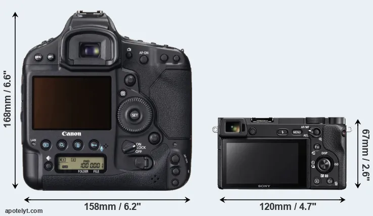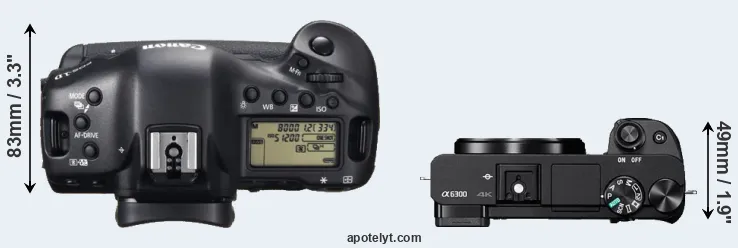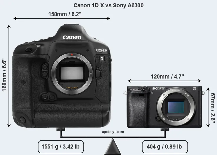 The side-by-side display below illustrates the physical size and weight of the Canon 1D X and the Sony A6300. The two cameras are presented according to their relative size. Three consecutive views from the front, the top, and the rear side are shown. All width, height and depth measures are rounded to the nearest millimeter.