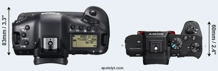 The side-by-side display below illustrates the physical size and weight of the Canon 1D X and the Sony A7R II. The two cameras are presented according to their relative size. Three successive views from the front, the top, and the rear are shown. All size dimensions are rounded to the nearest millimeter.