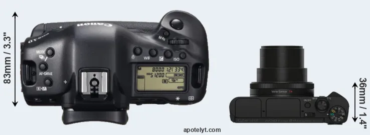 The above size and weight comparisons are to some extent incomplete and possibly misleading, as the HX90V has a lens built in, whereas the 1DX is an interchangeable lens camera that requires a separate lens. Attaching the latter will add extra weight and bulk to the setup. You can compare the optics available for the 1DX and their specifications in the Canon EF Lens Catalog.