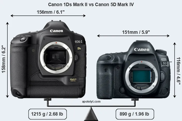 The side-by-side display below illustrates the physical size and weight of the Canon 1Ds Mark II and the Canon 5D Mark IV. The two cameras are presented according to their relative size. Three consecutive views from the front, the top, and the rear side are shown. All width, height and depth measures are rounded to the nearest millimeter.