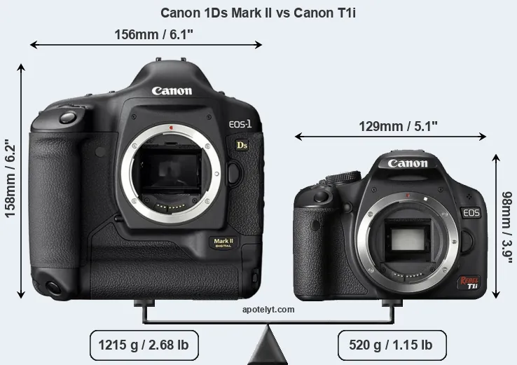 The physical size and weight of the Canon 1Ds Mark II and the Canon T1i are illustrated in the side-by-side display below. The two cameras are presented according to their relative size. Three consecutive views from the front, the top, and the rear side are shown. All width, height and depth measures are rounded to the nearest millimeter.