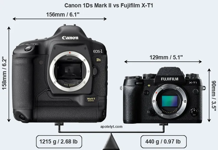 An illustration of the physical size and weight of the Canon 1Ds Mark II and the Fujifilm X-T1 is provided in the side-by-side display below. The two cameras are presented according to their relative size. Three consecutive views from the front, the top, and the rear side are shown. All width, height and depth measures are rounded to the nearest millimeter.