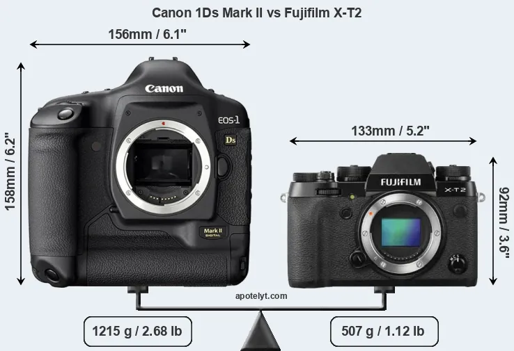 An illustration of the physical size and weight of the Canon 1Ds Mark II and the Fujifilm X-T2 is provided in the side-by-side display below. The two cameras are presented according to their relative size. Three consecutive views from the front, the top, and the rear side are shown. All width, height and depth measures are rounded to the nearest millimeter.