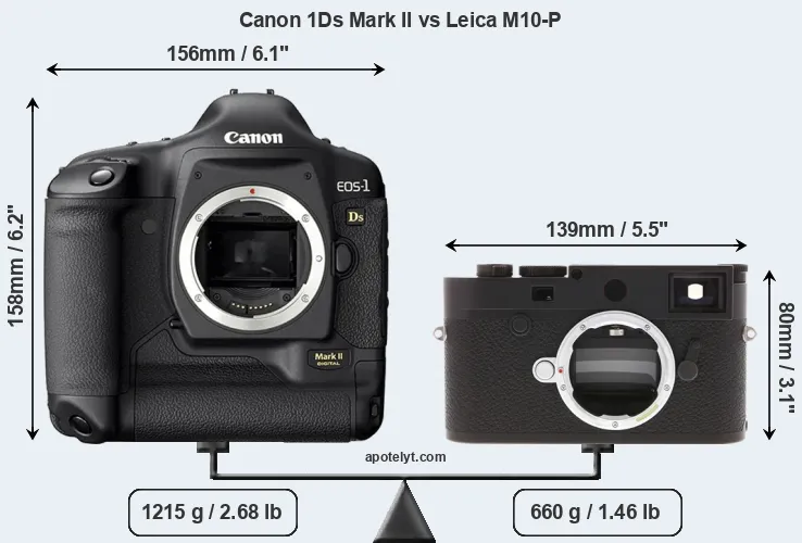 The side-by-side display below illustrates the physical size and weight of the Canon 1Ds Mark II and the Leica M10-P. The two cameras are presented according to their relative size. Three consecutive perspectives from the front, the top, and the back are available. All width, height and depth measures are rounded to the nearest millimeter.