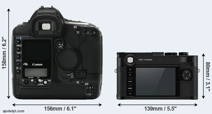 The above size and weight comparisons are to some extent incomplete since they do not consider the interchangeable lenses that both of these cameras require. Both cameras have similarly sized sensors, but DSLRs have a larger flange-to-focal plane distance than mirrorless cameras, which imposes contraints on the optical engineering process and generally leads to bigger and heavier lenses. You can compare the optics available for the two cameras in the Canon EF Lens Catalog (1Ds Mark II) and the Leica M Lens Catalog (M10-P).