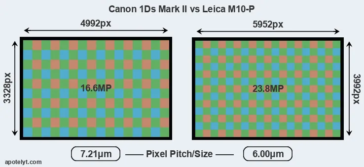 Despite having a slightly smaller sensor, the M10-P offers a higher resolution of 23.8 megapixels, compared with 16.6 MP of the 1Ds Mark II. This megapixels advantage comes at the cost of a higher pixel density and a smaller size of the individual pixel (with a pixel pitch of 6.00μm versus 7.21μm for the 1Ds Mark II). However, it should be noted that the M10-P is much more recent (by 13 years and 11 months) than the 1Ds Mark II, and its sensor will have benefitted from technological advances during this time that make it possible to gather light more efficiently. Coming back to sensor resolution, it should be mentioned that the M10-P has no anti-alias filter installed, so that it can capture all the detail its sensor resolves.