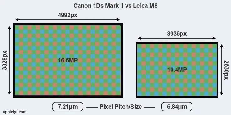Of the two cameras under consideration, the Canon 1Ds Mark II features a full frame sensor and the Leica M8 an APS-H sensor. The sensor area in the M8 is 44 percent smaller. As a result of these sensor size differences, the cameras have a format factor of, respectively, 1.0 and 1.3. Both cameras have a native aspect ratio (sensor width to sensor height) of 3:2.