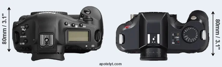 The side-by-side display below illustrates the physical size and weight of the Canon 1Ds Mark II and the Leica S2. The two cameras are presented according to their relative size. Three consecutive perspectives from the front, the top, and the back are available. All size dimensions are rounded to the nearest millimeter.