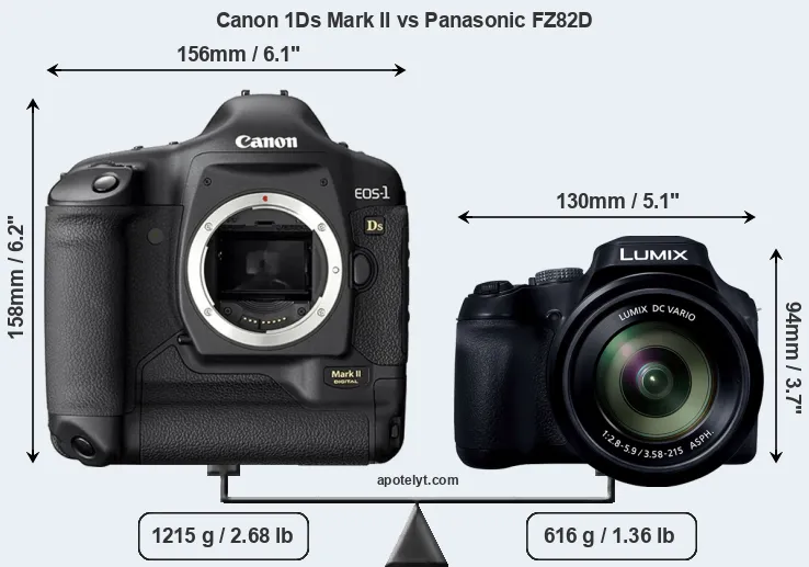 An illustration of the physical size and weight of the Canon 1Ds Mark II and the Panasonic FZ82D is provided in the side-by-side display below. The two cameras are presented according to their relative size. Three successive views from the front, the top, and the rear are shown. All width, height and depth dimensions are rounded to the nearest millimeter.