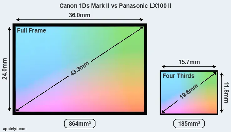 Of the two cameras under consideration, the Canon 1Ds Mark II features a full frame sensor and the Panasonic LX100 II a Four Thirds sensor. The sensor area in the LX100 II is 79 percent smaller. As a result of these sensor size differences, the cameras have a format factor of, respectively, 1.0 and 2.2. The sensor in the 1Ds Mark II has a native 3:2 aspect ratio, while the one in the LX100 II offers a 4:3 aspect. The LX100 II has the particularity of featuring a switch that allows to toggle between multiple aspect ratios, while maintaining the same field of view and full image resolution.