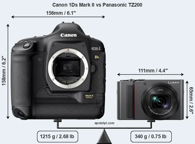 An illustration of the physical size and weight of the Canon 1Ds Mark II and the Panasonic TZ200 is provided in the side-by-side display below. The two cameras are presented according to their relative size. Three successive views from the front, the top, and the rear are shown. All width, height and depth dimensions are rounded to the nearest millimeter.