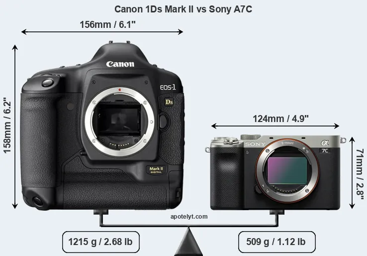 The physical size and weight of the Canon 1Ds Mark II and the Sony A7C are illustrated in the side-by-side display below. The two cameras are presented according to their relative size. Three consecutive perspectives from the front, the top, and the back are available. All width, height and depth dimensions are rounded to the nearest millimeter.