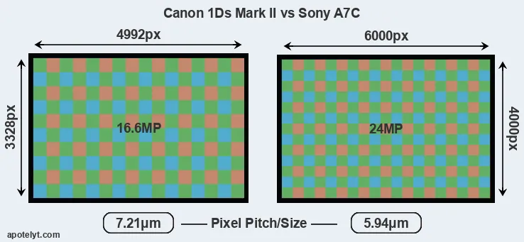 Despite having a slightly smaller sensor, the A7C offers a higher resolution of 24 megapixels, compared with 16.6 MP of the 1Ds Mark II. This megapixels advantage comes at the cost of a higher pixel density and a smaller size of the individual pixel (with a pixel pitch of 5.94μm versus 7.21μm for the 1Ds Mark II). However, it should be noted that the A7C is much more recent (by 15 years and 11 months) than the 1Ds Mark II, and its sensor will have benefitted from technological advances during this time that make it possible to gather light more efficiently.